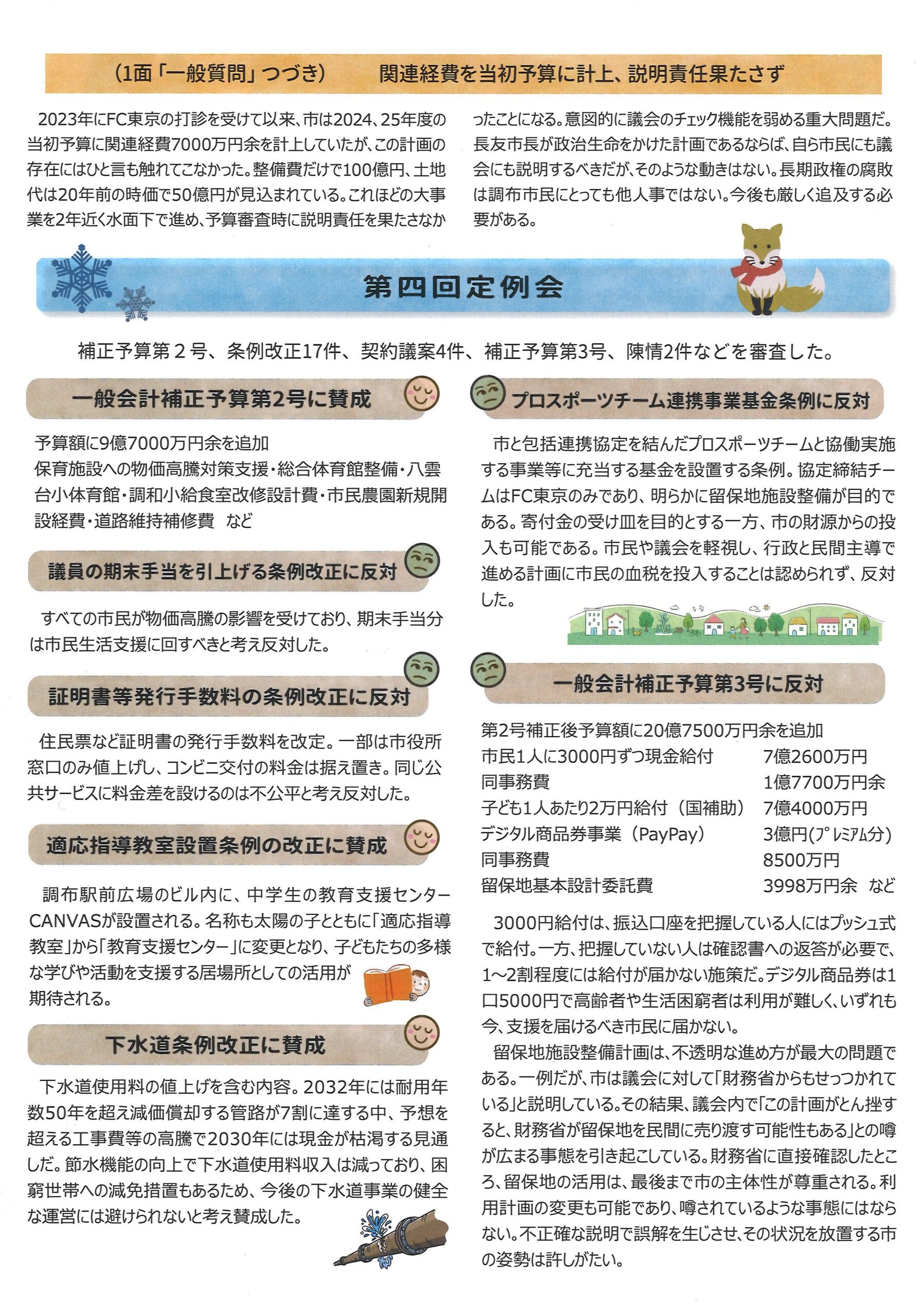 2023年にFC東京の打診を受けて以来、市は2024、25年度の当初予算に関連経費7000万円余を計上していたが、この計画の存在にはひと言も触れてこなかった。整備費だけで100億円、土地 代は20年前の時価で50億円が見込まれている。これほどの大事業を2年近く水面下で進め、予算審査時に説明責任を果たさなかったことになる。意図的に議会のチェック機能を弱める重大問題だ。長友市長が政治生命をかけた計画であるならば、自ら市民にも議会にも説明するべきだが、そのような動きはない。長期政権の腐敗は調布市民にとっても他人事ではない。今後も厳しく追及する必要がある。